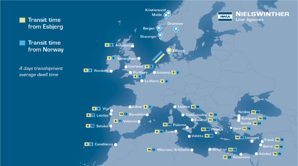 Get a fast and secure freight service from Denmark and avoid any transhipments. EuroMed connects Esbjerg directly to 20 ports in 14 different countries.